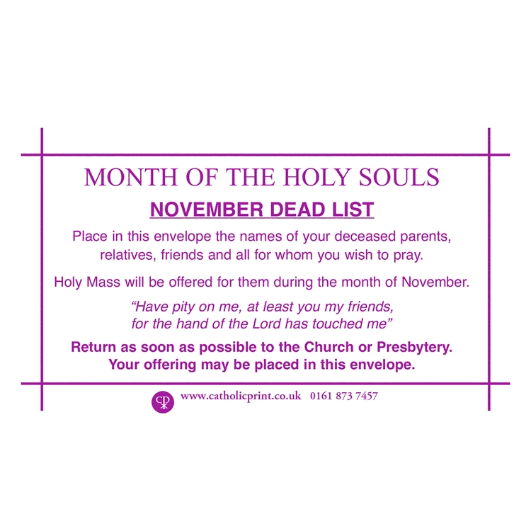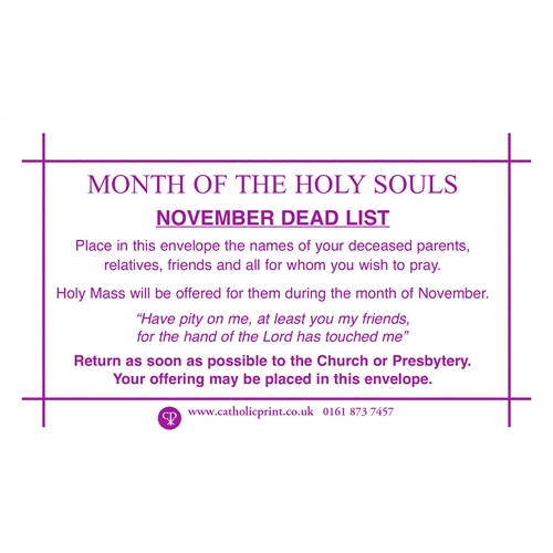NOVEMBER DEAD ENVELOPES: For the names of the deceased and the inclusion of an offering. 3 1/2 x 6 inch Manila Envelope printed with the following; MONTH OF THE HOLY SOULS NOVEMBER DEAD LIST place in this envelope the names of your deceased parents, relatives, friends and all for whom you wish to pray. Holy mass will be offered for them during the month of November. Have pity on me, at least you my friends, for the hand of the Lord has touched me. Return as soon as possibe to the Church or Presbytery. Your Offering may be placed in this envelope.